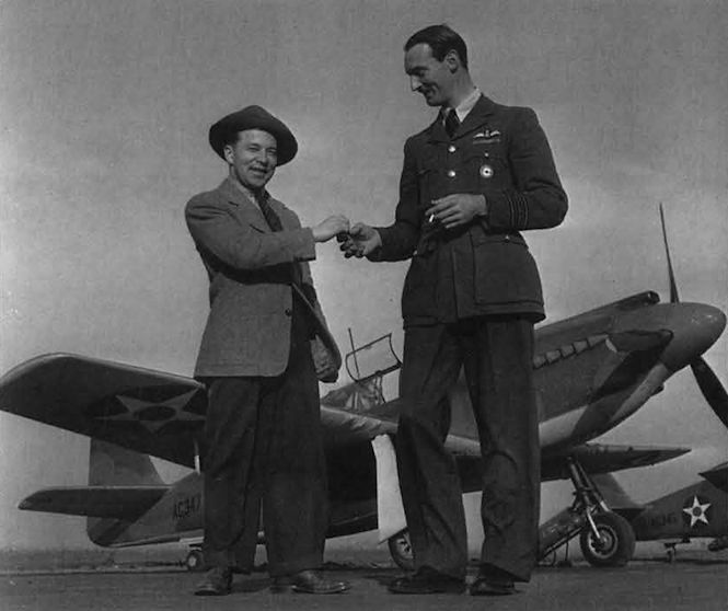Регистрационный номер: AG345, AG347 Several British test pilots were stationed in southern California to test Mustangs and other combat aircraft. Here Hawker Hurricane Battle of Britain ace Michael Crossley offers a cigarette to an NAA employee while Mk Is AG347 and AG345 await flight testing.
