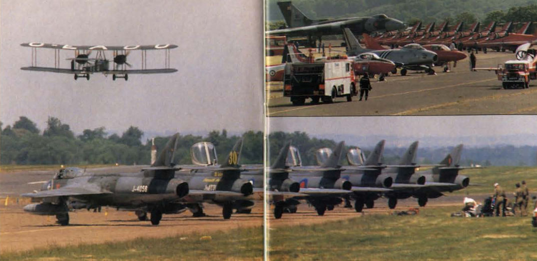 Регистрационный номер: G-EAOU [2], J-4058, N71MY [2], NX71MY [2] Vimy replica NX71MY “G-EAOU” departs Biggin Hill in 1996 with a Hunter line-up in salute.