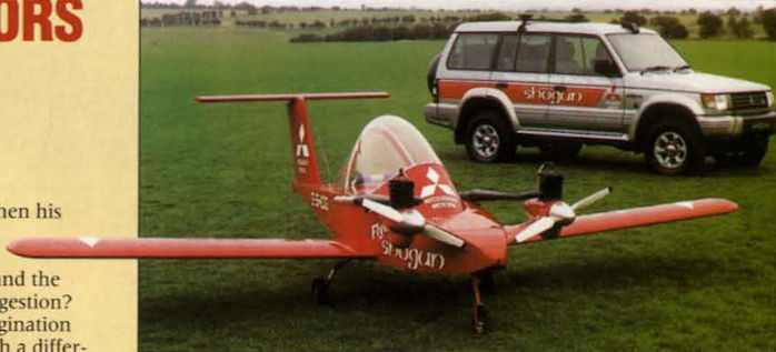 The smallest twin-engined aircraft in the world, the Cri-Cri, takes off from the roof of a Mitsubishi Shogun.