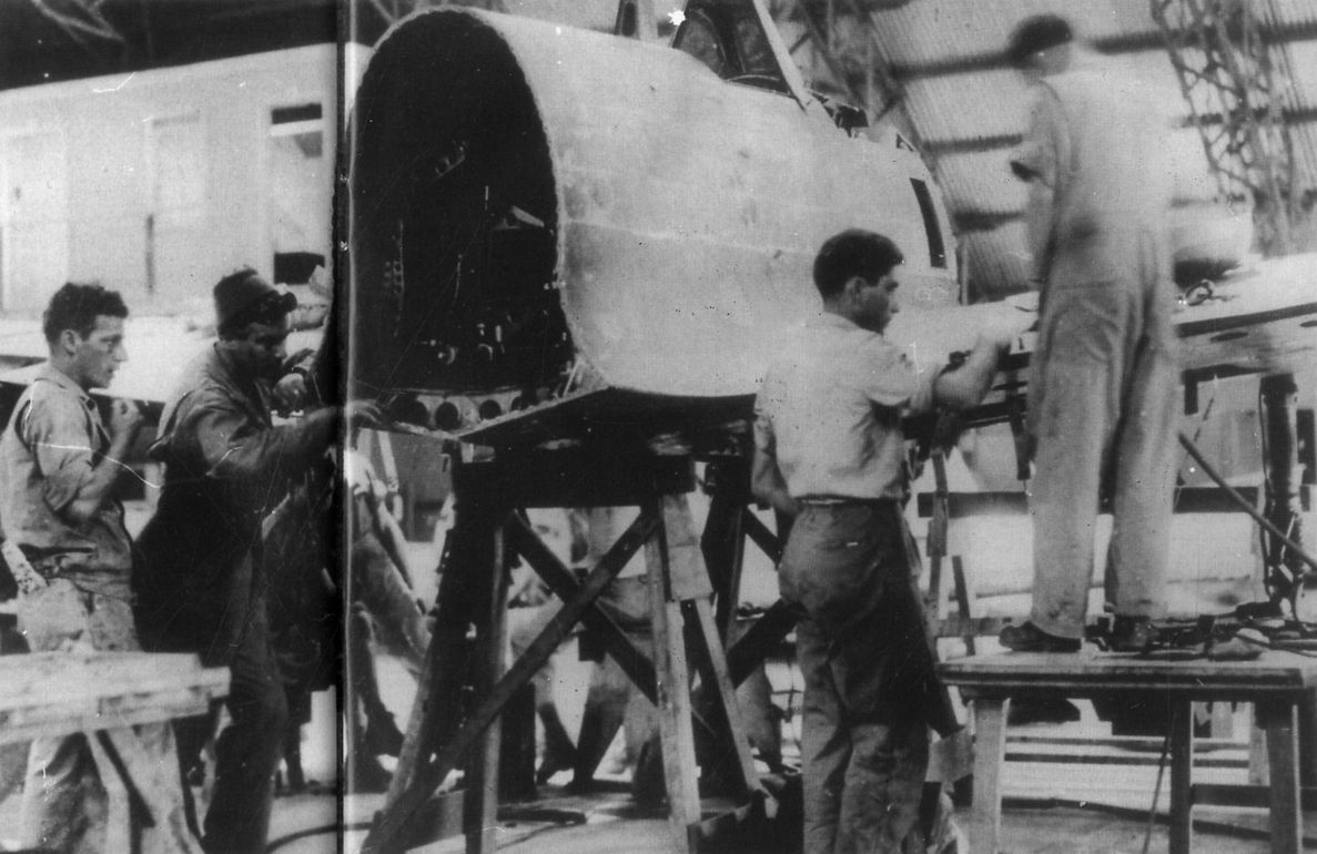 Work under way in Hangar 7 on the first Zero Model 32 rebuilt from the components captured at Buna.