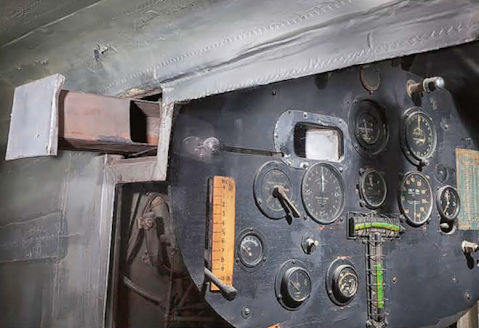 Регистрационный номер: NX211 [6] Детальное фото заржавевшего перископа сзади и вид на приборную доску самолета Ryan NY-P «Spirit of St. Louis». Обратите внимание: квадратное отверстие в корпусе перископа предназначено для выхода основного потока воздуха, минуя кабину. Левой двери на самолете не было, а остекление по всему периметру было оклеено перкалью. Чтобы сделать этот снимок, специалисты музея просто варварски вырвали стекло