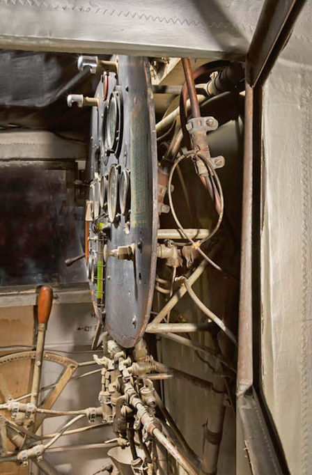 Регистрационный номер: NX211 [6] Детальное фото приборной доски самолета Ryan NY-P «Spirit of St. Louis». Обратите внимание: приборная панель отделена от задней переборки топливного бака, чтобы разместить выдвижной перископ в этом пространстве. При монтаже проводки использовались как надежные соединения труб хомутами, так и грубейшая импровизация в виде проволочек и ленточных завязочек