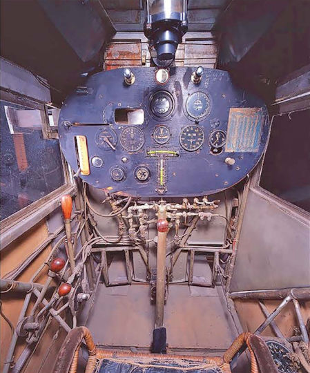 Запыленная кабина подлинного линдбергского самолета Ryan NY-P «Spirit of St. Louis» с простейшим оборудованием кабины пилота. Можно самостоятельно убедиться, что ни во время взлета, ни во время посадки Линдберг ничего не видел вперед. Чуть левее середины приборной доски видно квадратное отверстие перископа, выдвинутого в рабочее положение, а слева от него - ручка для его перемещения. Место бывшей левой двери было занято рукоятками органов управления двигателем и топливной системой. Обратите внимание: как тогда, так и сейчас в правой двери нет стекла