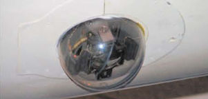 Детальный вид на перископ нижнего вида, совмещенный с дрейфовым визиром, предназначенным для компенсирования смещения, вызванного силами Кориолиса. Перископ установлен в кардановом подвесе и вращается на 360°, обеспечивая обзор в нижней полусфере. Фотография самолета Lockheed U-2C (Ser.56-6680) сделана в филиале Имперского военного музея («Imperial War Museum») в Даксфорде