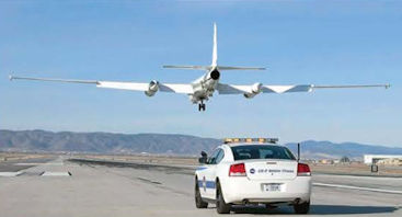 Регистрационный номер: N806NA Посадка одноместного высотного научно-исследовательского самолета NASA Lockheed ER-2 N806NA (Ser. 80-1063). «Внешние глаза» пилота сидят в автомобиле Dodge с надписью «ER-2 Mobile Chase» («Мобильная погоня за ER-2»). Фото сделано в декабре 2010 года на аэродроме базы NASA в Центре эксплуатации самолетов им. Драйдена («Dryden Aircraft Operations Facility»), город Палмдейл, шт. Калифорния