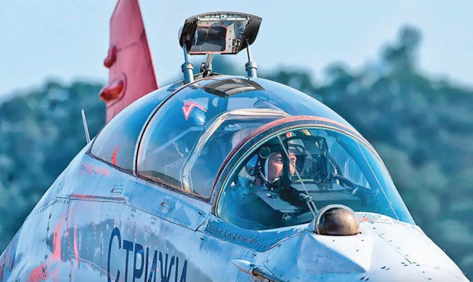 МиГ-29УБ пилотажной группы «Стрижи» с поднятым перископом инструктора. Сложная кинематика движения перископа с его огромными зеркалами снаружи и внутри второй кабины потребовала установки трех совместно действующих гидравлических цилиндров