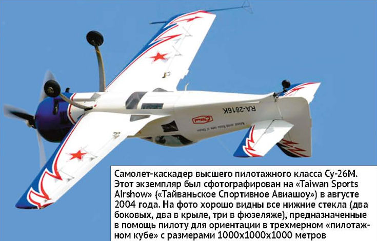 Регистрационный номер: RA-2816K Самолет-каскадер высшего пилотажного класса Су-26М. Этот экземпляр был сфотографирован на «Taiwan Sports Airshow» («Тайваньское Спортивное Авиашоу») в августе 2004 года. На фото хорошо видны все нижние стекла (два боковых, два в крыле, три в фюзеляже), предназначенные в помощь пилоту для ориентации в трехмерном «пилотажном кубе» с размерами 1000х1000х1000 метров
