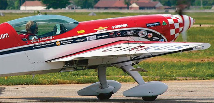 Одноместный EA-300S с вырезами для иллюминаторов по бокам и в нижней части фюзеляжа пилотессы Патти Уогстафф во время подготовки к взлету. Фото сделано в мае 2006 года