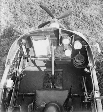 Вид с места пилота специального разведывательного варианта Voisin III. На стоянке через единое нижнее стекло можно даже разглядеть каждую травинку. Обратите внимание на большой вырезанный квадрат в полу вокруг ручки управления - это дополнительное место также служило для наблюдения. Генератор с пропеллером в носу фюзеляжа предназначался для питания британской радиостанции Type 1. Самолет из эскадрильи V114 во Флёри-сюр-Эр (район Мааса), 1916 год