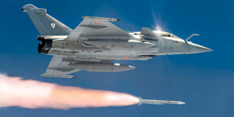 A two-seat Rafale B of Escadre de Chasse 30, the Mont-de-Marsan-based test unit, lets fly with an MBDA Meteor test round. An extended ejection ram can just be seen on the starboard underwing pylon