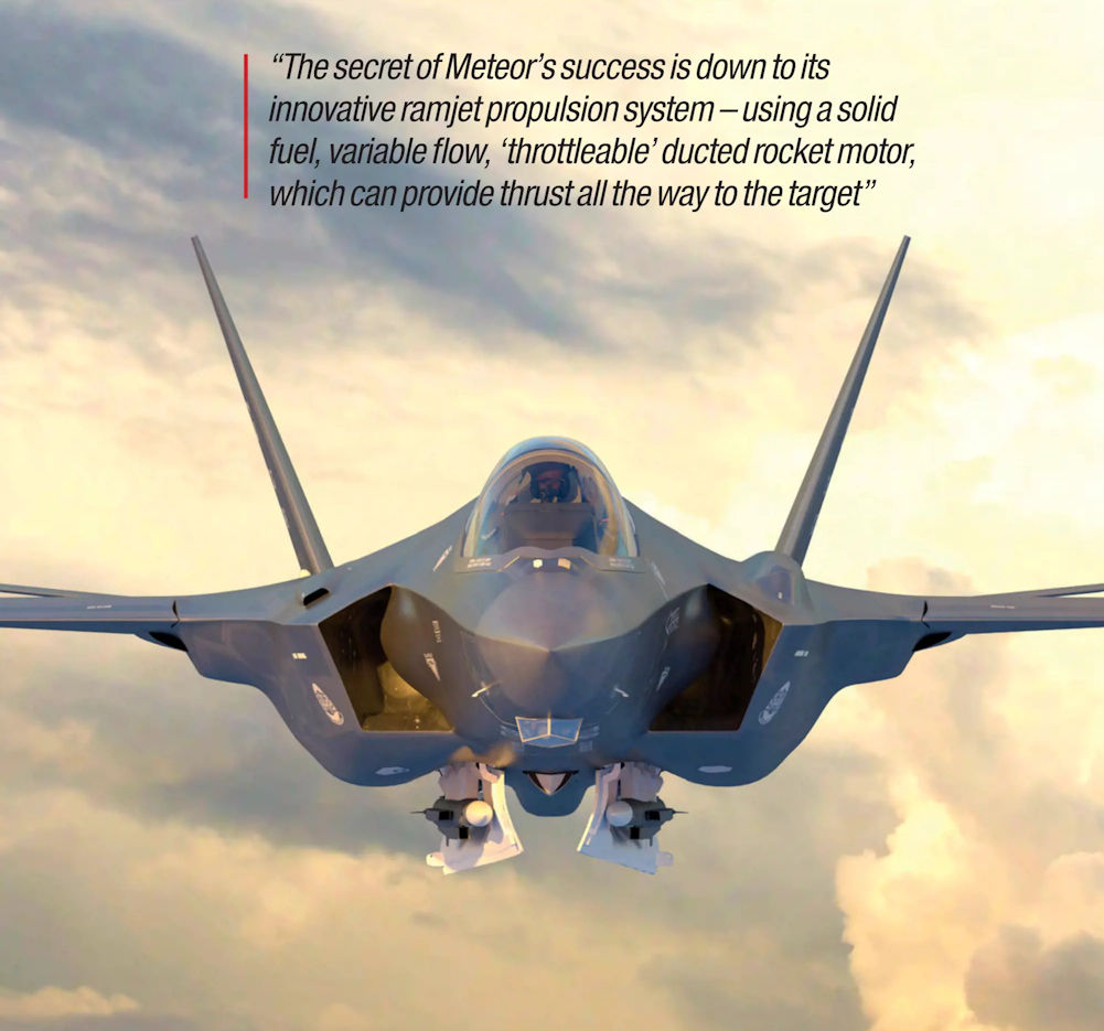 The intakes for the Meteor's Ramjet motor lend the missile a distinctive appearance. The ramjet can be throttled, saving fuel for the endgame and giving the weapon a huge No Escape Zone