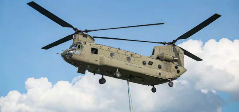 A US Army CH-47F Chinook fitted with BAE Systems ATIRCM system (the jam head is visible aft). CIRCM is significantly smaller and lighter and draws less power than the legacy ATIRCM installation