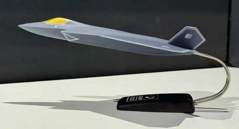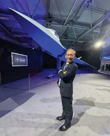 Hitoshi Shiraishi (Senior Fellow, GCAP with Mitsubishi Heavy Industries) posing with the GCAP model. Japan supported the GCAP effort at Farnborough with its industry executives and even its Defence Minister, Minoru Kihara