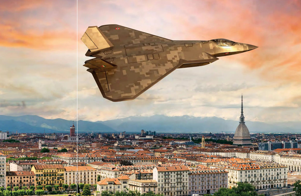 A CGI image of a GCAP fighter flying over Rome. Interestingly, Leonardo's CGI images sometimes show more external detail than similar images issued by BAE Systems