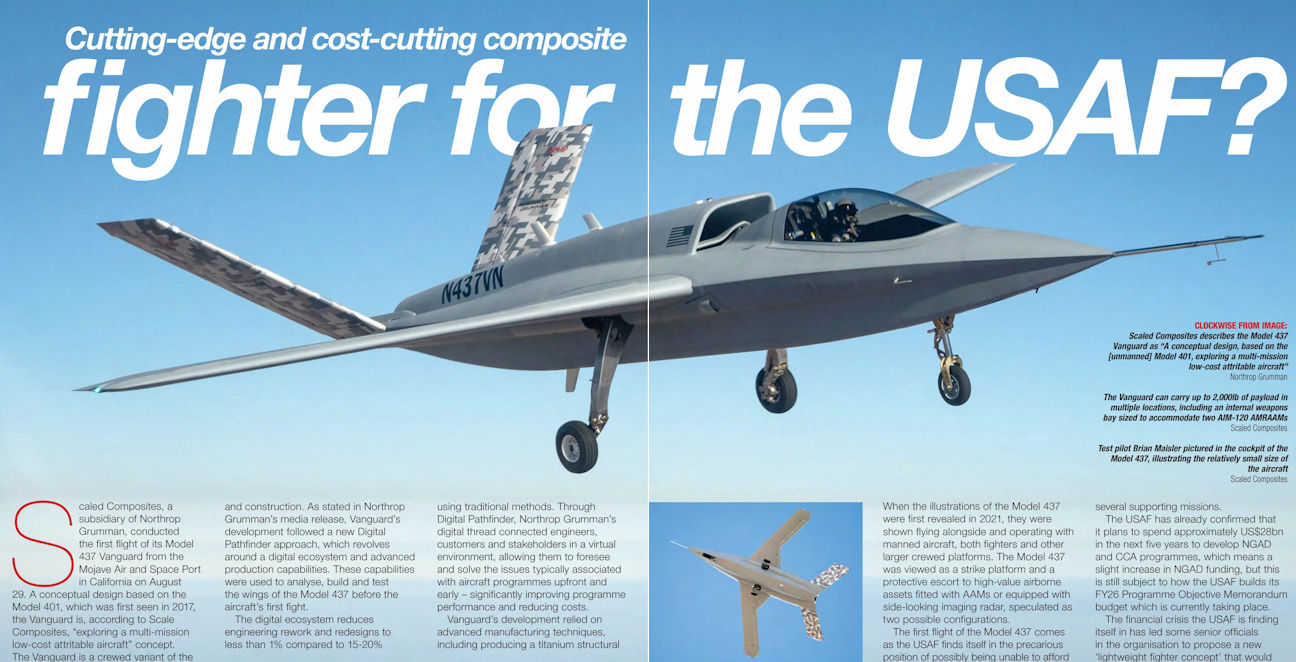 Регистрационный номер: N437VN Scaled Composites describes the Model 437 Vanguard as "A conceptual design, based on the [unmanned] Model 401, exploring a multi-mission low-cost attritable aircraft"