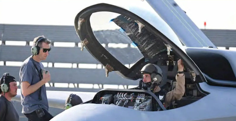 Test pilot Brian Maisler pictured in the cockpit of the Model 437, illustrating the relatively small size of the aircraft