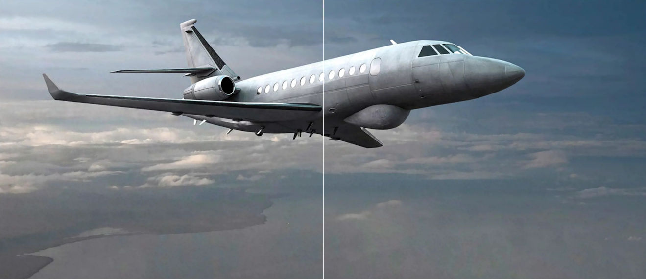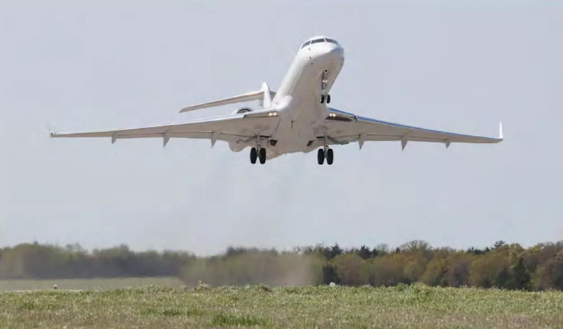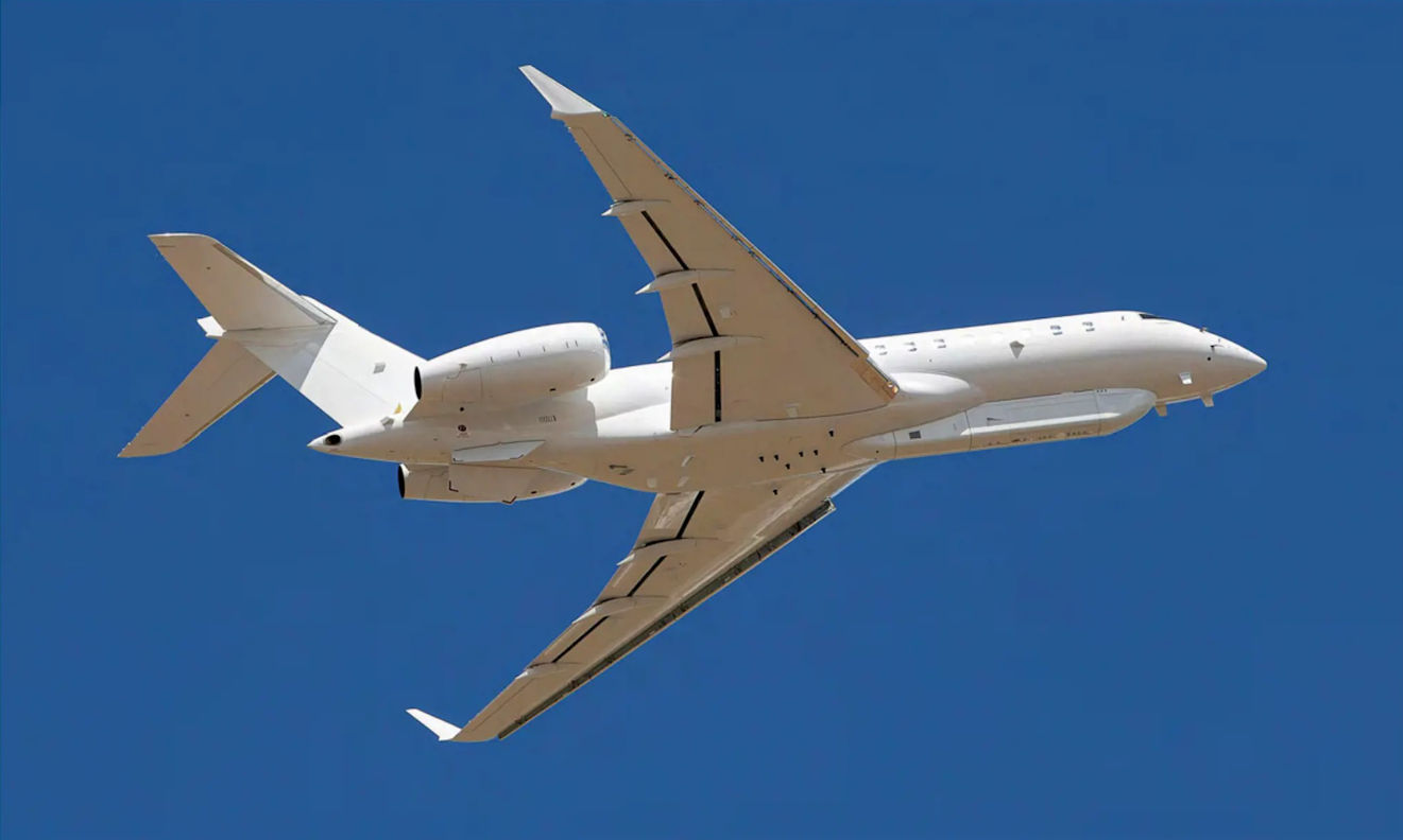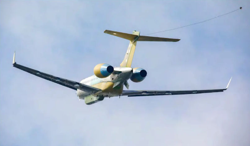 The first ATHENA-R, based on the Bombardier Global 6500 conducts a test flight before receiving its final coat of paint. This view illustrates the numerous modifications made to the airframe, including the 29ft (8.8m) canoe housing mounted on the underside