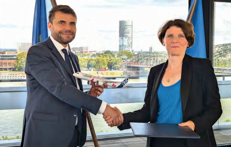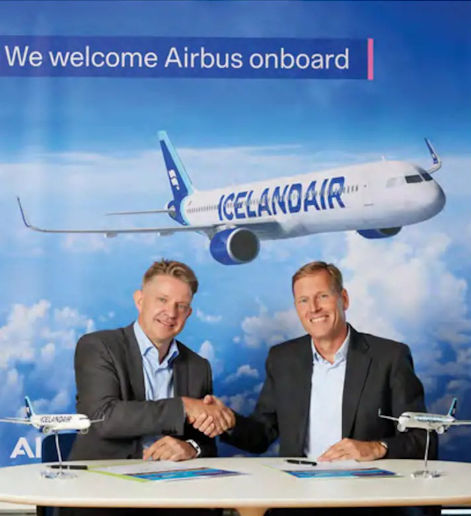 Icelandair CEO Bogi Nils Bogason (left) at the 2023 announcement that the carrier placed an order for the A321XLR