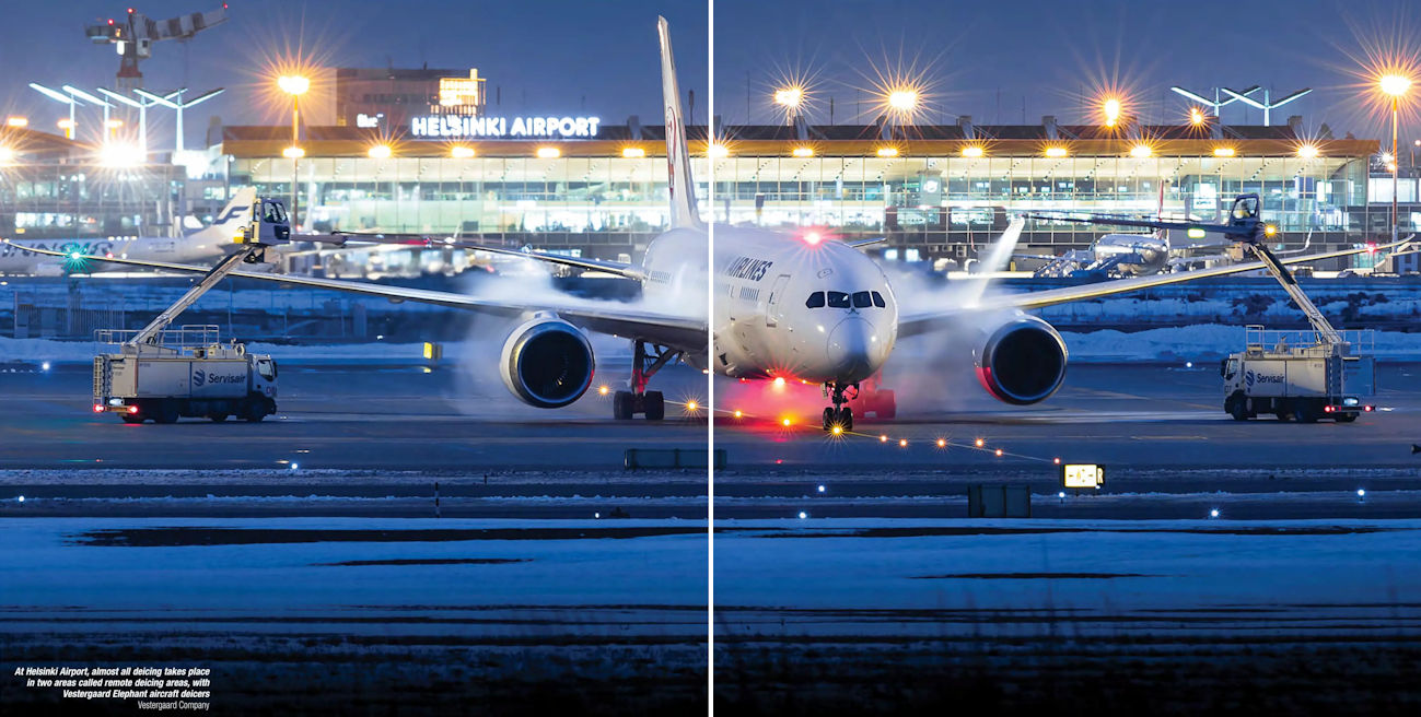 At Helsinki Airport, almost all deicing takes place in two areas called remote deicing areas, with Vestergaard Elephant aircraft deicers