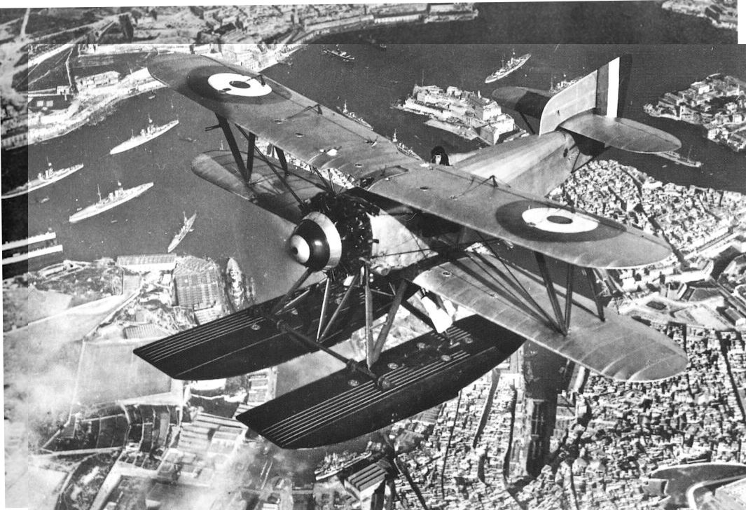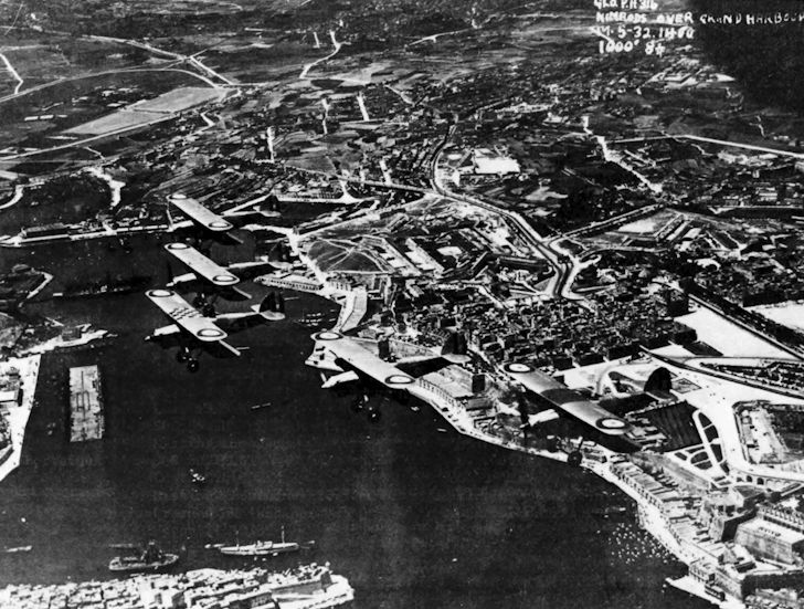 Hawker Nimrods of No.408 Flight over Grand Harbour on 17 May 1932. The lead aircraft carries a checkerboard identification on the centre-section.