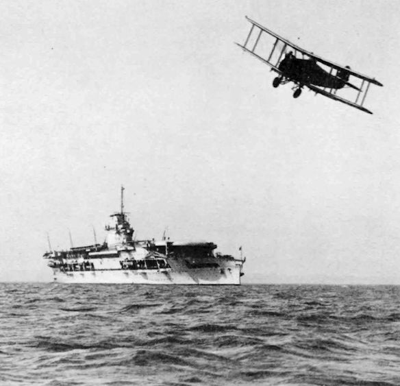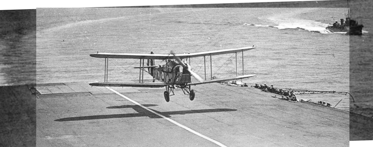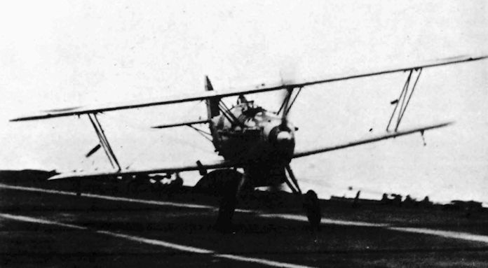 Aircraft landing on in pre-arrester wire days is a Fairey IIIF spotter-reconnaissance aircraft.