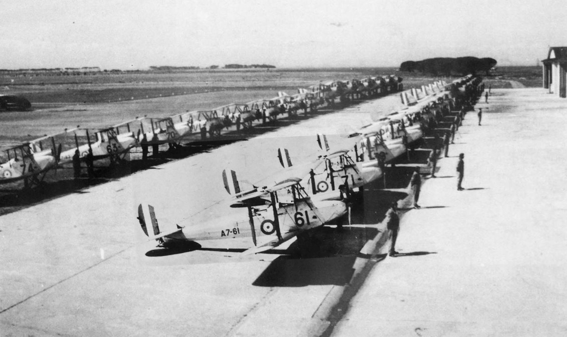 A line-up of RAAF Moths during the thirties with A7-61 (c/n 1354) prominent in the foreground ahead of A7-71.Самолёты на фотографии: Avro Tutor/Sea Tutor/Prefect / Type 621/646/626 - Великобритания - 1929De Havilland Gipsy Moth / Moth X - Великобритания - 1928Westland Wapiti - Великобритания - 1927