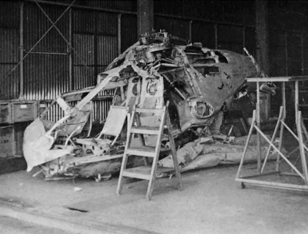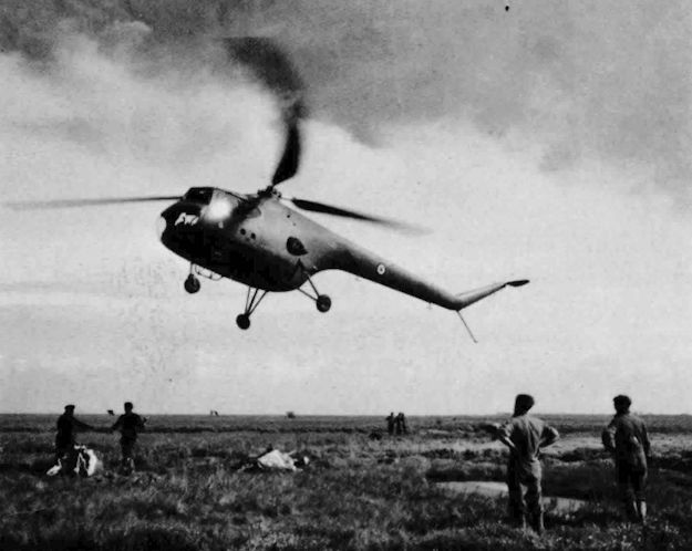 Регистрационный номер: WE261, XD196 Sycamore HR.13 XD196 of No. 275 Squadron recovering wreckage from Venom WE261 of the Central Fighter Establishment on Holbeach Ranges, 31.7.53
