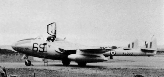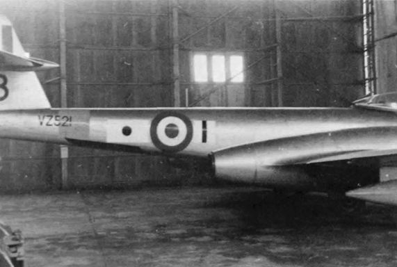 Регистрационный номер: VZ521 The photograph of another Meteor F.8, VZ521, coded '3' taken at Woodvale on 6 February 1960. This carries a similar marking and was modified as a target tug.