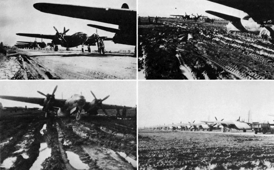 In this SAAF photograph, can be seen Spitfire VIIIs, IXs, XIs and XIXs, Mustang IIIs and IVs, Bostons, Baltimores, a Beaufighter, a Kittyhawk, Mitchells and Havocs of the USAAF, an Expediter, Vengeances, Liberators and a silver Thunderbolt. Amid this mass of aircraft are the lines of Marauders which probably used a fair proportion of their fuel load to get to the runway. The local farmer appears to have left home.Самолёты на фотографии: Beechcraft Model 18 / C-45 Expeditor - США - 1937Bristol Beaufighter - Великобритания - 1939Consolidated B-24 Liberator - США - 1939Curtiss P-40D Kittyhawk / Warhawk - США - 1941Douglas A-20 Boston / Havoc / P-70 Nighthawk - США - 1938Martin Baltimore / Type 187 - США - 1941North American B-25 Mitchell / PBJ-1 - США - 1940North American P-51 Mustang - США - 1940North American P-51D Mustang - США - 1944Republic P-47D-25 / P-47N Thunderbolt - США - 1943Supermarine Spitfire FR.XIV / FR.XVIII / PR.XIX - Великобритания - 1943Supermarine Spitfire Mk.IX / XVI - Великобритания - 1942Supermarine Spitfire Mk.VI / VII / VIII - Великобритания - 1942Supermarine Spitfire PR / FR - Великобритания - 1939Vultee A-35 Vengeance - США - 1941