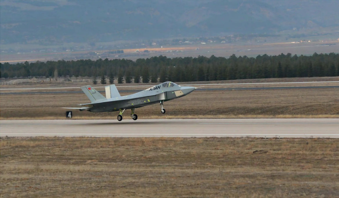 Kaan GTU-01 taking off on its second flight. The aircraft's first flight was once planned for 2026, but the programme has been accelerated significantly. Two General Electric F110 engines power the aircraft, but an indigenous powerplant is under development