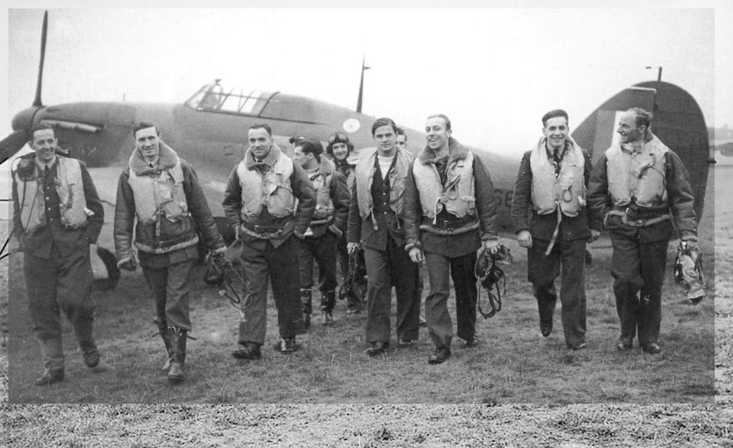 Летчики 303-й эскадрильи, слева направо: Ферич, Кент, Гржещак, Радомский, Зубач, Локучевский, Роговский и Шапошников на фоне истребителя Hurricane Mk I № V6684/RF-F Витольда Урбановича.Самолёты на фотографии: Hawker Hurricane - Великобритания - 1935