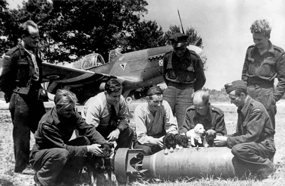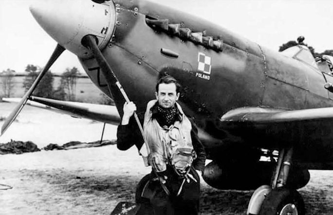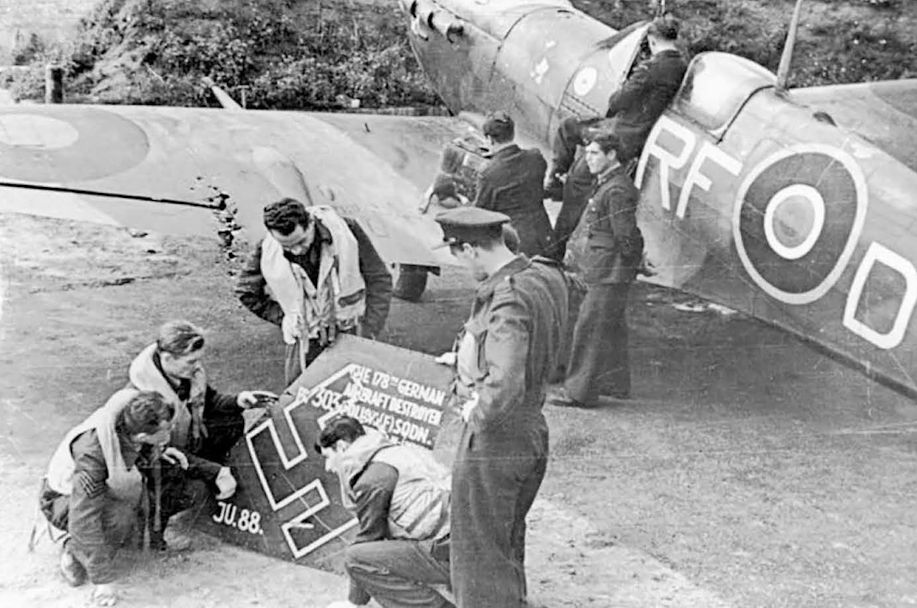 Пилоты 303-й польской «Костюшковской» ИАЭ демонстрируют кусок киля сбитого ими немецкого бомбардировщика Ju‑88. Из сделанной на нём поляками надписи следует, что это 178-й сбитый немецкий самолёт на счету 303-й ИАЭ (впрочем, данная цифра плохо стыкуется с послевоенными исследованиями). Англия, вторая половина 1941 г. На заднем плане истребитель «Спитфайр» Mk.V