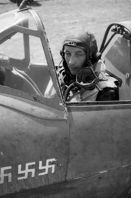Станислав Скальский в кабине «Спитфайра» Mk.IX из состава 145-й ИАЭ RAF. Аэродром Габес, Тунис, начало 1943 г. Отметки на борту в виде белых свастик означали сбитые фашистские самолеты. У Скальского была интересная манера подписывать лётный шлем (фамилия написана не на подкладке, а на внешней стороне, над лбом). Возможно, это был «счастливый» шлемофон