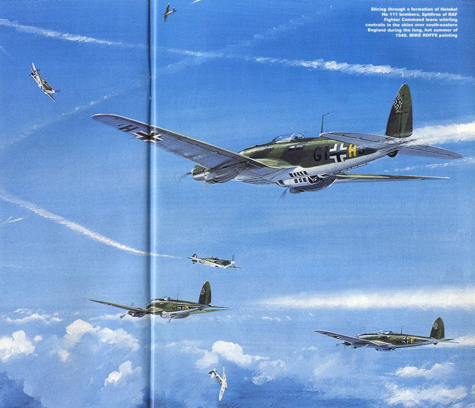 Slicing through a formation of Heinkel He 111 bombers, Spitfires of RAF Fighter Command leave whirling contrails in the skies over south-eastern England during the long, hot summer of 1940. MIKE ROFFE painting.