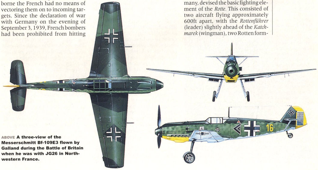A three-view of the Messerschmitt Bf-109E3 flown by Galland during the Battle of Britain when he was with JG26 in Northwestern France.