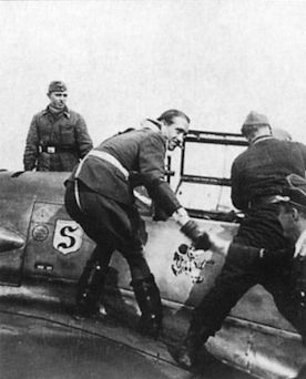 Wearing a lifejacket and flying boots over his Service dress uniform, Galland clambers into his Bf 109E-3 for a sortie over South-east England in summer 1940.