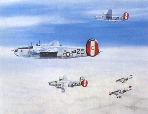 In this painting by Mai Reeves, USAAF B-24 Liberators of the 485th Bomb Group, escorted by P-51D Mustangs, head for a target somewhere in Germany.