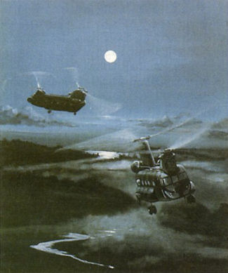 Mal Reeves draws on his own experiences in this depiction of two RAF Chinooks on a low-level night exercise.