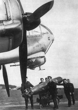 A Mk XII torpedo being wheeled to a Beaufort fitted with a blister gun under the nose.