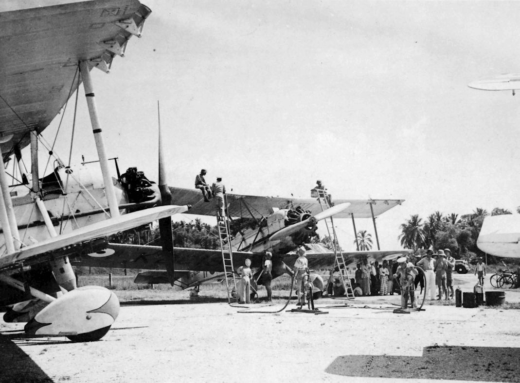 Vildebeests of 100 Sqn being refuelled at Kuala Lumpur in 1938. Note the bystanders in the shade under the wing.