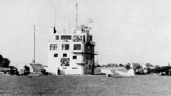 Регистрационный номер: G-AHCM A control tower with Auster Autocrat G-AHCM and a Royal Navy Seafire. There is a plan on the side of the tower but it does not seem to tie in with an airfield we can identify.