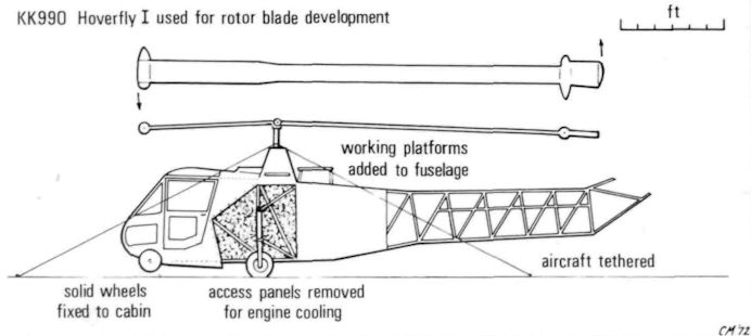 From Cliff Minney comes this photograph and drawing of the Hoverfly I used for testing rotor blades with tip jets. The aircraft, KK990, is in the well-protected rotor spinning bowl at Luton and was used for static tests only, no attempt being made to fly it.