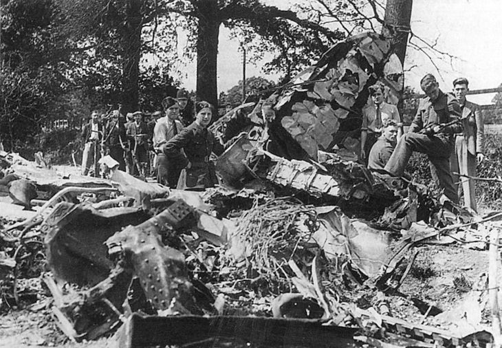 The aftermath at Fullers Lane, East Woodhay, on the morning of Tuesday July 30, 1940, as RAF personnel, civilians, police and soldiers poke among the wreckage of G1+CS. Only the tail section remains substantially intact, but fire has scorched away all trace of the three fishes unit emblem. A soldier inspects one of Heinz Boker’s MG15 machine-guns across his knee. Meanwhile, three German airmen remain at large in the countryside.