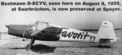 Регистрационный номер: D-ECYV Bestmann D-ECYV, seen here on August 8, 1959, at Saarbrucken, is now preserved at Speyer.