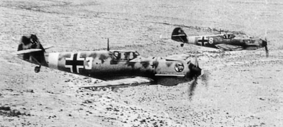 A rotte of Messerschmitt Bf 109E-4N/Trop fighters of 1/JG27 on patrol over the North African desert in 1941.