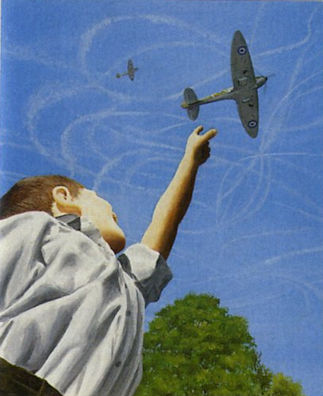 Up Again by Graham Henderson depicts a wartime boy’s excitement at watching Spitfires against a background of contrails during the Battle of Britain.