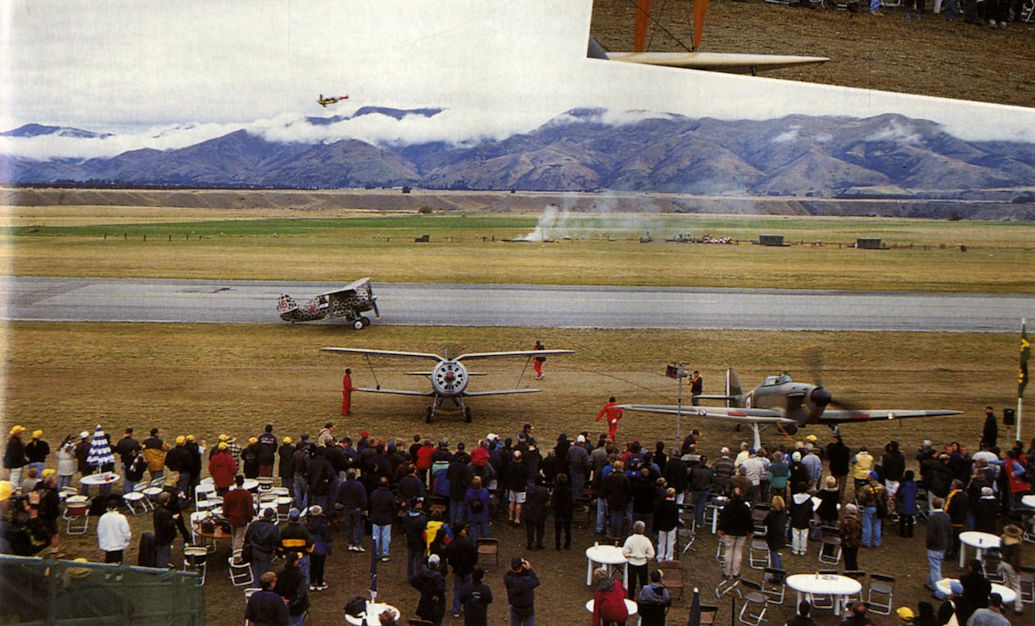A sight that can only be Wanaka: two Polikarpov Chaikas and a Hurricane line up to face the crowd. The smoke in the background is from an airfield attack setpiece.