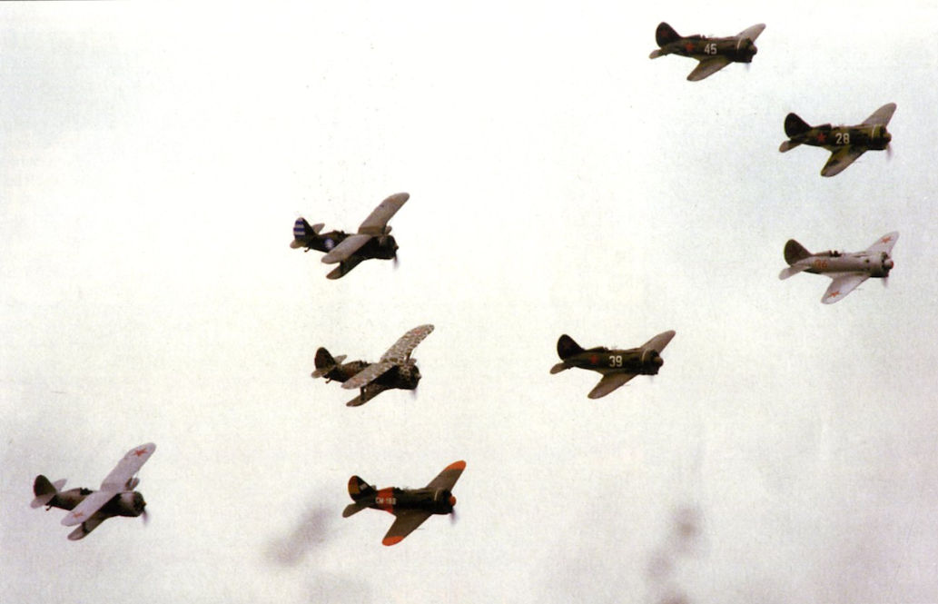 A sight that had not been seen for more than 50 years. Three Polikarpov I-153s pursue five Polikarpov I-16s for the formation flypast. Most of these aircraft are for sale, so this sight may never be repeated.