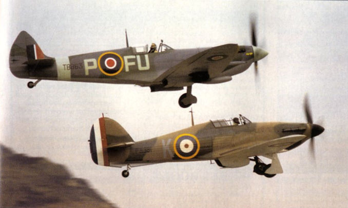 Самолёты на фотографии: Hawker Hurricane - Великобритания - 1935Supermarine Spitfire Mk.IX / XVI - Великобритания - 1942