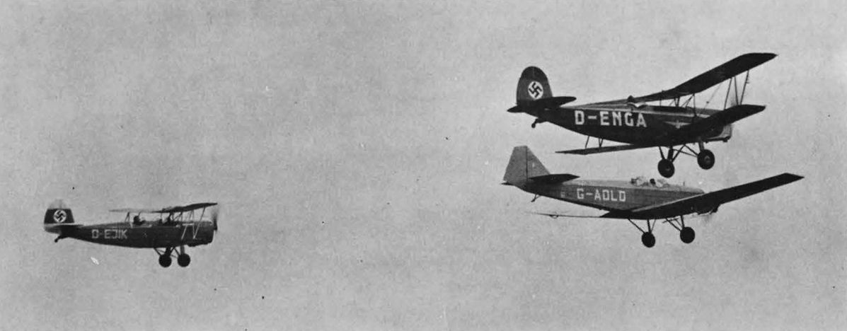 Регистрационный номер: D-EJIK, D-ENGA, G-ADLD D-ENGA together with two-seater D-EJIK flown by Troll and Poulet being led in open vic formation by B.A.Swallow G-ADLD, pilot Monteith. Ironically perhaps, the Swallow was destroyed by enemy action at Lympne in 1940.